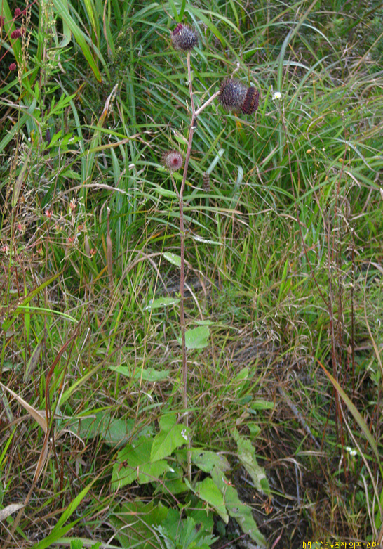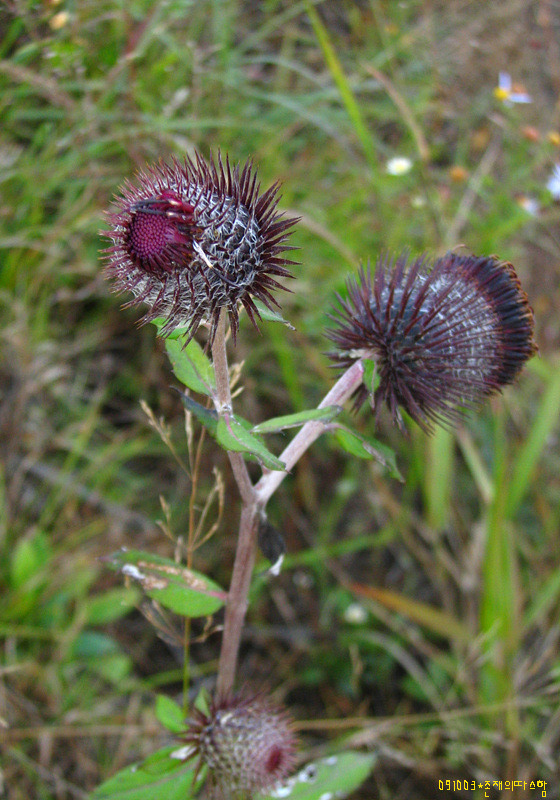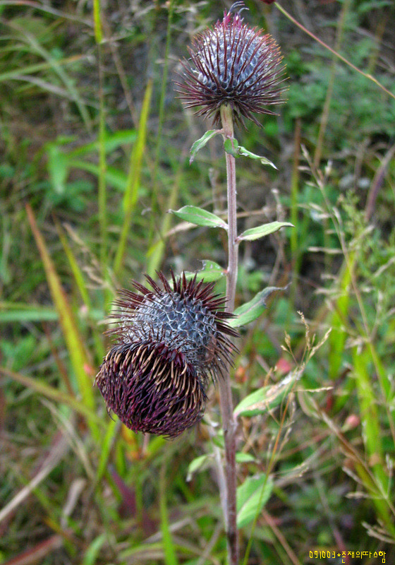 꽃은 9-10월에 피며 지름 5cm정도로서 원줄기 끝 또는 가지 끝에 달리고 꽃이 필 때는 밑을 향한다. 총포는 둥글며 길이 3cm, 지름 4.5-5.5cm로서 거미줄같은 백색 털이 있고 갈자색 또는 흑록색이며 포편은 여러 줄로 배열되고 끝이 뾰족하며 날카롭고 외편이 짧다. 꽃부리는 길이 20mm정도로서 겉이 자주색이다. 수과는 길이 7mm 정도이며 관모는 길이 18mm정도로서 갈색이다. <국가생물종지식정보시스템>