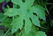 줄기는 높이 60~120㎝이고 윗부분에서 짧은 가지가 갈라지며 흔히 엉킨 털이 있다. 잎은 어긋나기하고 중앙 이하의 잎은 작으며 꽃이 필 때쯤 되면 쓰러지고 그 윗부분의 잎은 3~4개가 드문드문 달리며 콩팥 모양이고 끝이 짧게 뾰족해지며 밑부분은 심장저이고 길이 7~17㎝, 폭 11~25㎝로서 양면에 털이 없거나 뒷면 맥 위에 짧은 털이 있으며 가장자리에 불규칙한 결각상의 톱니가 있고 좌우 밑부분에 1~2개의 돌기가 있으며 엽병은 길이 4.5~9㎝로서 기부가 귀처럼 넓다.