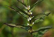 줄기는 곧추서며 60㎝까지 자란다. 잎은 넓은 피침형으로 어긋나는데, 잎끝과 잎밑이 뾰족하며 잎가장자리에는 뾰족한 톱니들이 있다.