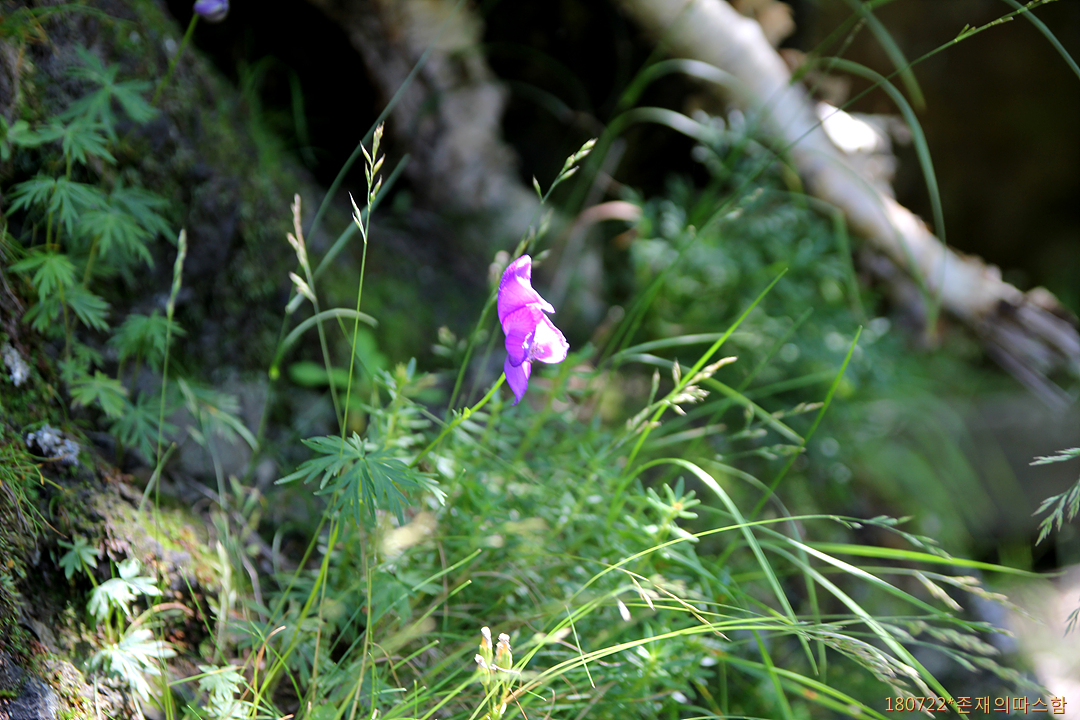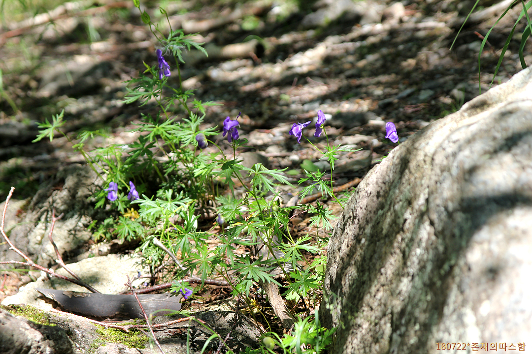 비룡폭포(장백폭포)에서 흘러내리는 승사하의 물이 협공을 이루어 흘러내려가는 물가에 피는 아주 키 작은 꽃이다. 20cm 높이 줄기 끝에서 1-3개의 투구 모양의 청보라색 청초한 꽃을 피운다. 중국 이름은 '高山乌头'(고산조두).