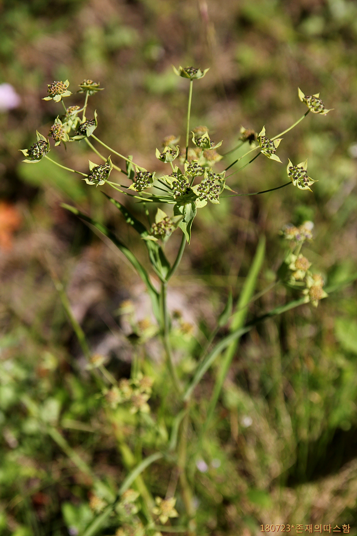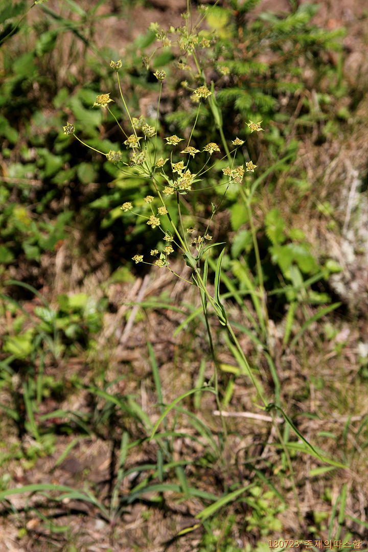 줄기는 꽃차례와 더불어 높이가 40㎝에 달하는 것이 있으나 보통 8~12㎝이고 털이 없다. 식물체에 비해 상대적으로 지하부의 뿌리가 굵고 땅속 깊이 들어간다. 근생엽은 선형이며 폭 1~3㎜로 7맥이 있고, 줄기잎은 좁으며 밑부분이 원줄기를 감싸지만 윗부분의 것은 좁고 피침형이며 끝이 뾰족하고 맥이 많으며 어긋나기 한다. 포는 달걀 모양이고 3개이며 길이 1~2㎝, 폭 5~8㎜로서 끝이 길게 뾰족해진다. 소산경(小傘梗)은 7~8개이고 작은 포는 5개이며 넓은 달걀 모양이고 끝이 갑자기 뾰족해지며 길이 6~9㎜로서 자주색 반점이 있고 화경이 거의 없다.