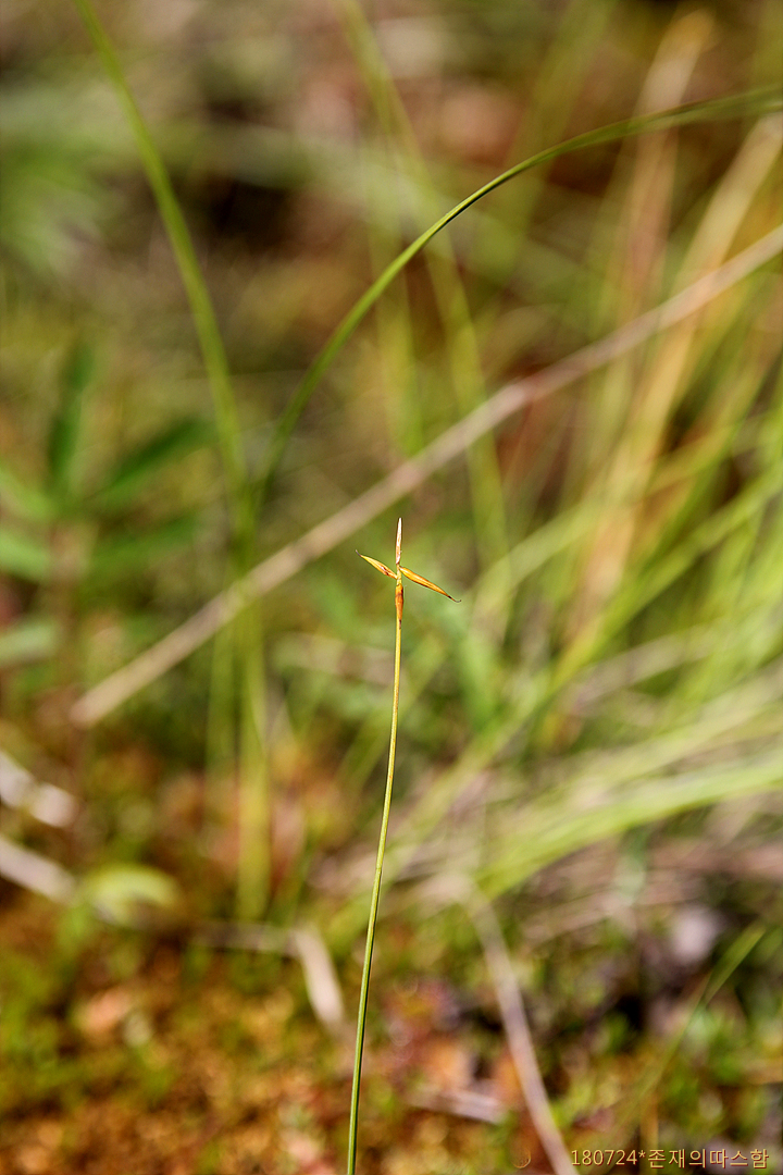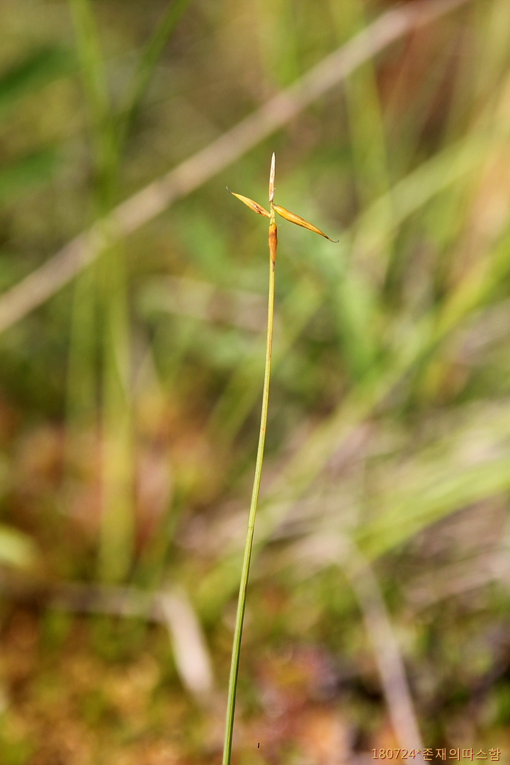 지하경이 길게 옆으로 벋고, 식물체는 성기게 자란다. 줄기 높이 10-20cm, 약 너비 0.6mm이고, 단면은 삼릉형이다. 위쪽은 까끌거리고, 아래쪽은 밋밋하다. 잎 줄기보다 길이가 짧고, 너비 1-1.5mm이다. 기부의 엽초 담갈색이다.
