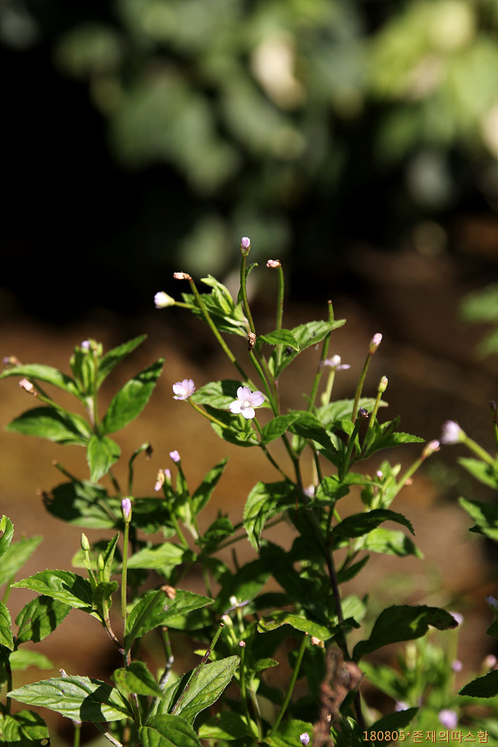 꽃은 7~8월에 피며 길이 4.5~8㎜로서 연한 홍색 또는 백색이고 줄기 끝 또는 윗부분의 잎겨드랑이에 1개씩 달리며 화경은 짧고 씨방과 더불어 굽은 털이 있다. 꽃받침은 피침형이고 길이 4~7㎜로서 4개로 갈라지며 꽃잎도 4개로서 2개로 갈라지고 수술은 8개, 암술은 1개, 암술머리는 두상이며 암술대는 가늘고 암술머리보다 훨씬 길며, 씨방은 하위이다. 열매는 삭과로 좁고 길며 길이 3.5~8㎝이고 소과경은 길이 4~15㎜이며 종자는 피침상 긴 타원형이며 길이 0.8~1.2㎜로서 젖꼭지 모양의 소돌기와 백색 털이 있다. < 국가생물종지식정보시스템>