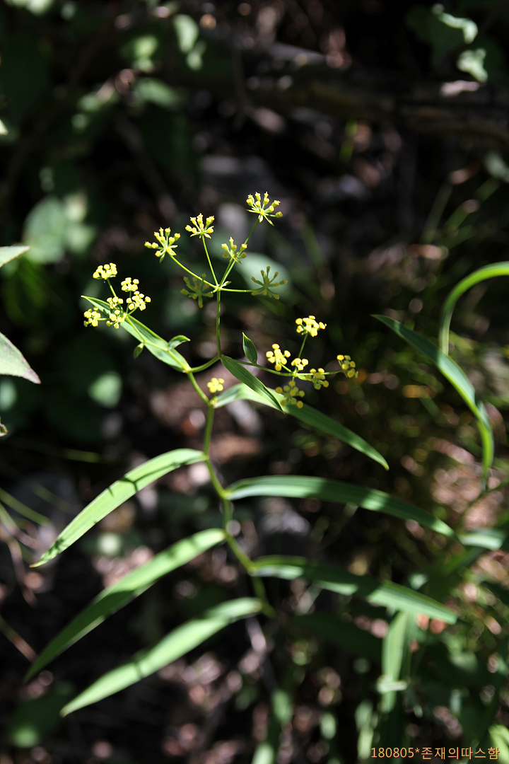 꽃은 8~9월에 피며 황색이고 원줄기 끝과 가지 끝의 겹우산모양꽃차례에 많이 달리며 소산경은 2~7개이고 총포조각은 길이 0~15㎜로서 선상 피침형이며 소산화서에 5~10개의 꽃이 달리고 소총포는 5편으로 길이 2.5~4㎜이고 넓은 선형 또는 긴 타원형이다. 꽃잎은 5개이며 안으로 굽고 5개의 수술이 있으며 씨방은 하위이다. 열매는 타원형이며 좌우로 조금 납작하고 길이 35㎜로서 9~10월에 성숙한다. 분과. <국가생물종지식정보시스템>