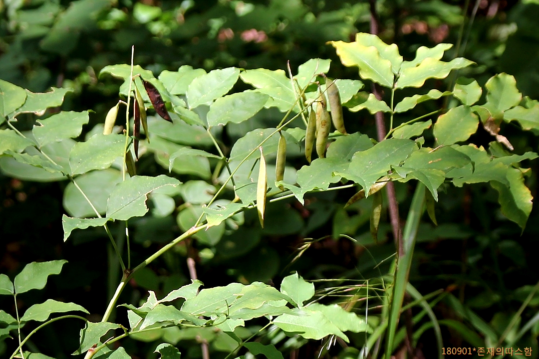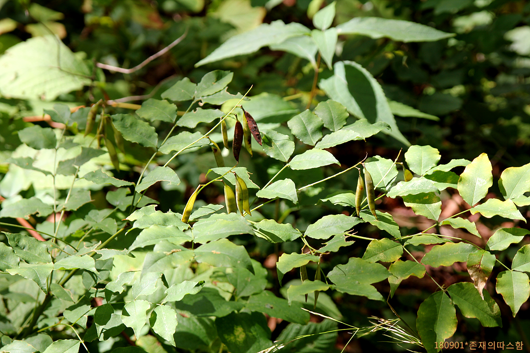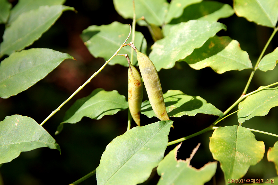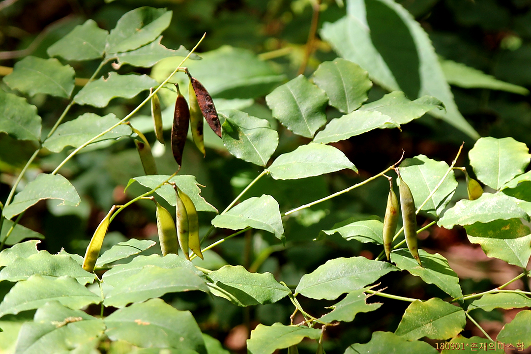 총상꽃차례는 잎겨드랑이에서 발달히며 화경이 길고 꽃은 6월에 피며 길이 12㎜ 정도로서 자줏빛이 도는 황색이고 꽃자루가 밑으로 처지며 꽃받침은 통형이고 끝이 5개로 갈라진다. 열매는 협과로 선상타원형이며 털이 없고 2~4개의 종자가 들어 있다. <국가생물종지식정보시스템>
