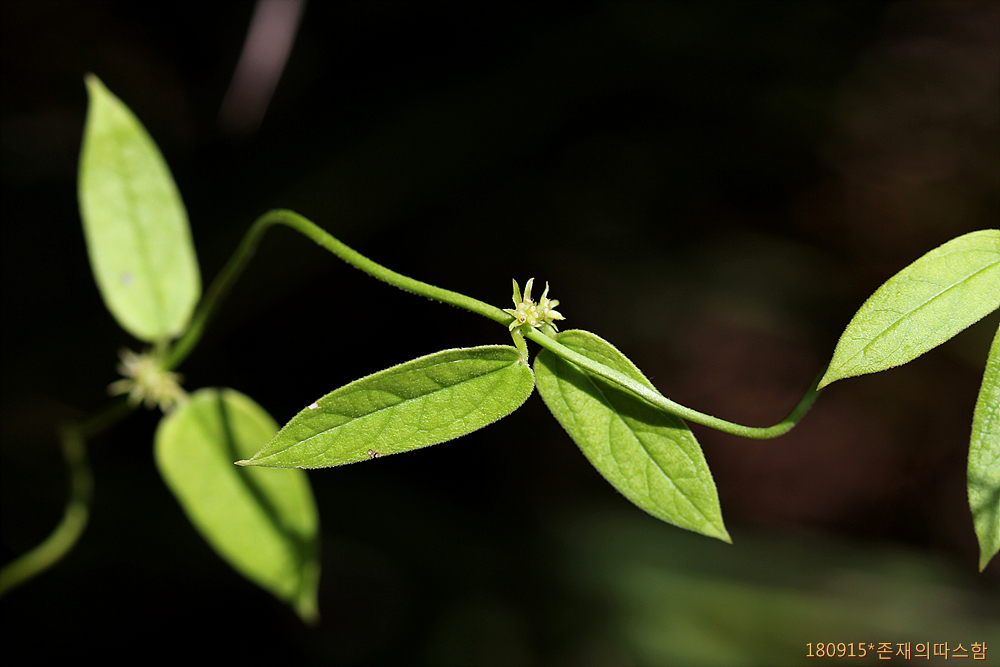 줄기는 길이 40~100㎝로서 곱슬털이 다소 있고 밑부분이 곧게 서며 윗부분은 덩굴성이다. 잎은 마주나기하고 곧추선 부분의 잎은 크며 막질이고 넓은 피침형 또는 좁은 난상 긴 타원형이며 길이 5~12㎝, 폭 1~3㎝로서 끝이 길게 뾰족해지고 밑부분이 둥글거나 아심장저이며 가장자리는 밋밋하고 엽병은 길이 2~4㎜이다.