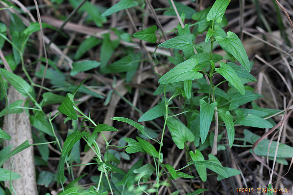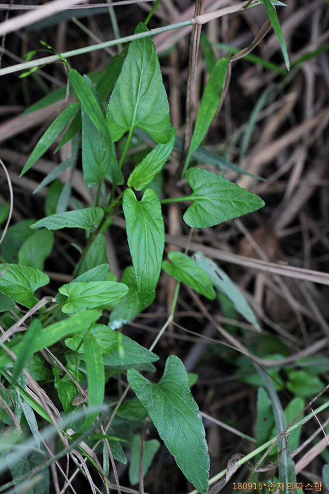 줄기는 높이 30~50㎝이며 원줄기는 모여나기하고 털이 없으며 가늘고 곧게 서며 밑부분이 다소 흑색이다. 근경이 짧다. 잎은 어긋나기하고 삼각상 피침형이며 둔두이고 밑부분은 다소 심장저이며 길이 4~10㎝이고 밑부분의 폭이 1~3㎝로서 가장자리에 희미하고 둔한 톱니가 있다. 엽병은 길이 2~5㎝이며 탁엽은 녹색이고 길이 3~6㎝로서 큰 톱니가 있다.