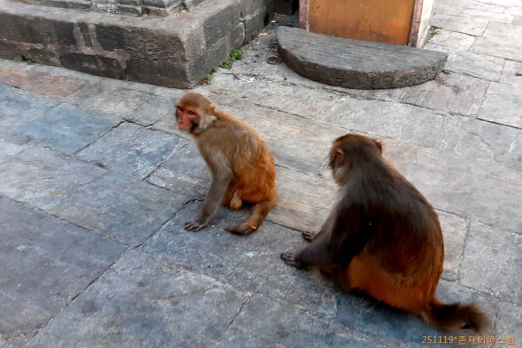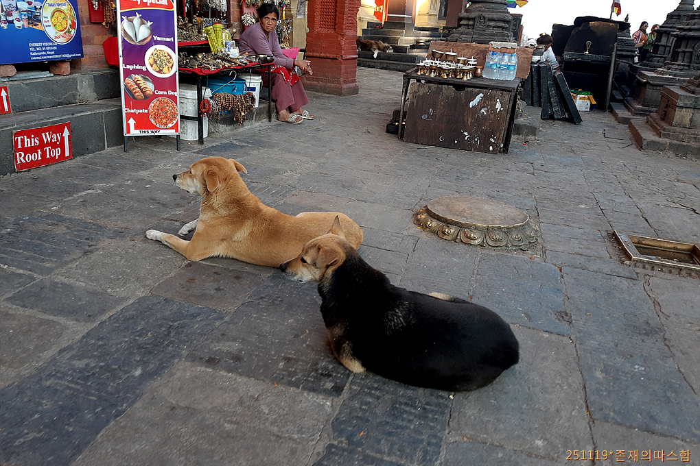 한편는 많은 개들이 미동도 없이 엎드려 있거나 떡실신한 모습으로 잠들어 있어 부산스런 원숭이들과 선명한 대조를 이룬다. 몹시 사이가 바쁜 관계를 '견원지간(犬猿之間)'이라 하는데, 이 말이 왜 생겼나 싶을 정도로 서로에 무관심하고 충돌 또한 없이 평화롭기만 하다.(이곳 개들은 낮에는 잠을 자거나 쉬고 밤에는 활발히 돌아다니는 듯하다)