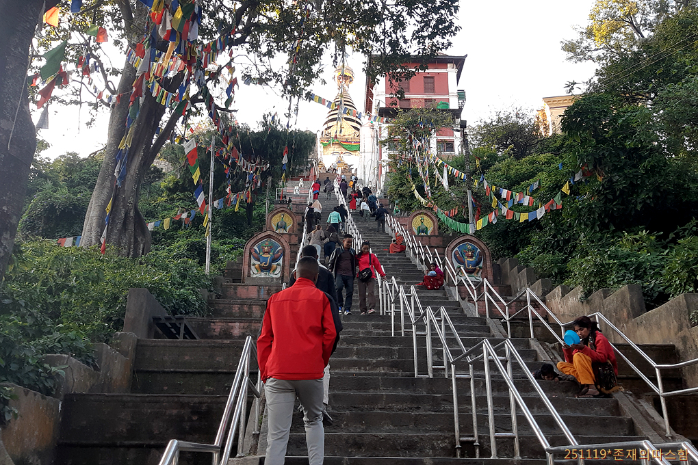 스와얌부 스투파로 오르기 위해서는 수백 개의 돌계단길을 올라야 한다. 365개라응 기록도 있고 385개라는 기록도 있다.