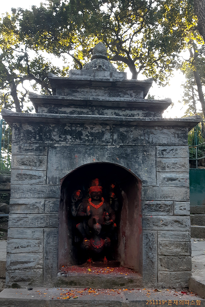 히말라야 그림들이 걸려 있는 건물 옆에 석불 입상이 눈길을 끈다. 옆 벽에는 'Dipanker buddha'라 새겨진 동판이 있다. 7세기 커다란 하나의 돌로 만든 것이라는 기록과 함께 . 아마도 연등불(Dipankara)을 가리키는 이름인 듯하다.