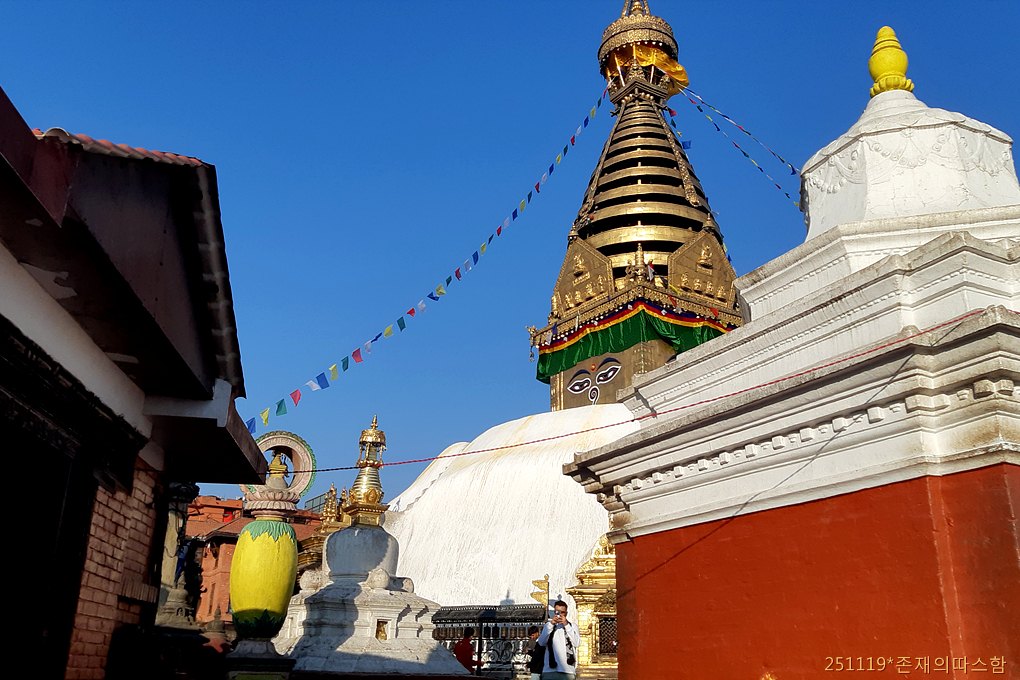 사원의 기원을 전하는 전설이 흥미롭다. 한때 거대한 호수였던 카트만두 계곡, 어느 날 그 호수 한가운데에서 커다란 한 송이 연꽃이 피어났단다. 문수보살이 칼로 산을 쪼개고 호수로 길을 내자 호수의 물이 빠지고 연꽃은 높은 언덕이 되었다. 그곳에 스와얌부 사원이 세워졌다는 것이다.
