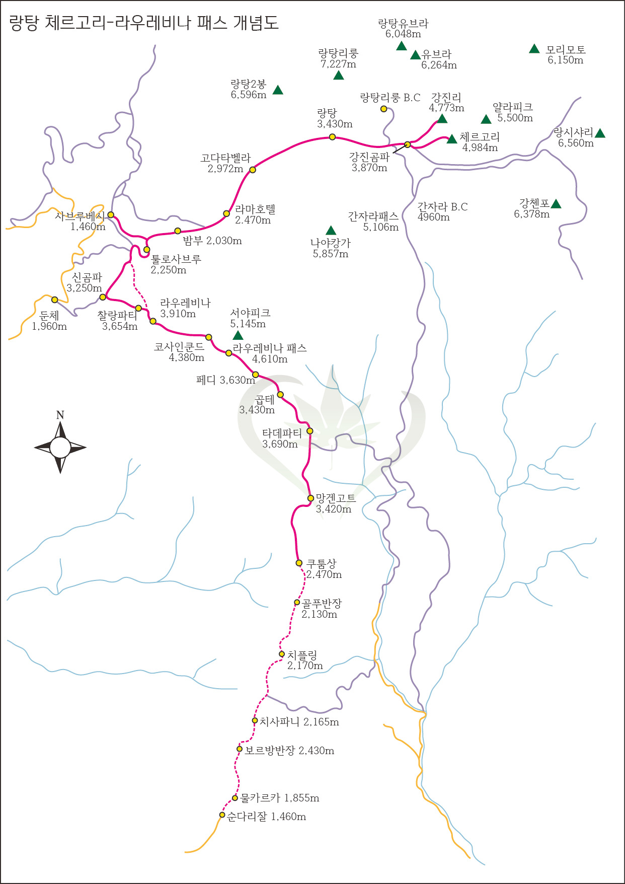 붉은선은 카트만두에서 출발하여 북쪽으로 샤브루베시까지 가는 길. 푸른 선은 동쪽으로 강진곰파와 체르고리까지 이어지는 랑탕 트레킹 코스, 다시 되돌아 나와 남쪽으로 이어지는 코사인쿤드-할렘부 트레킹 코스.