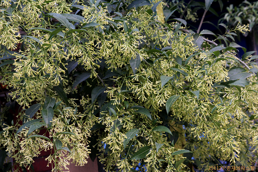 숙소 입구 담에 기대어 흐드러지게 꽃을 피운 야래향( Night-blooming jasmine)
