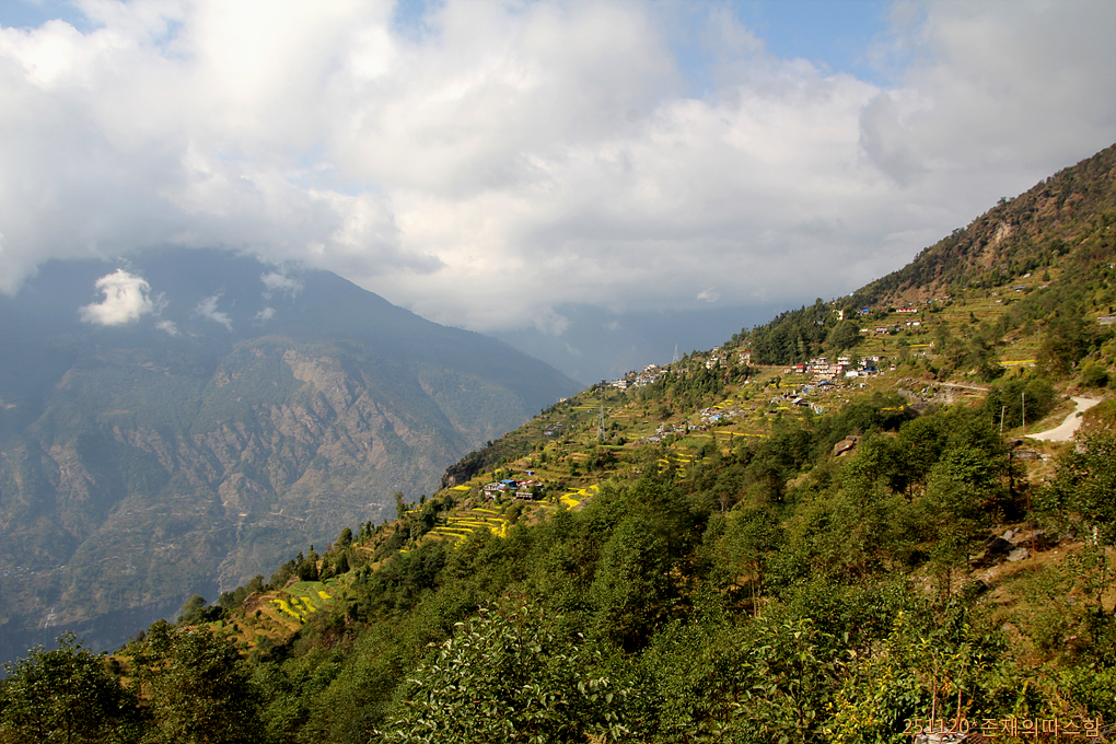 고도 2000m 대의 산 허릿길을 한 시간쯤 달리다 계단식 논이 아름다운 곳에서 차를 멈춰 잠시 포토타임을 갖는다. 왼쪽 구름 저 너머에 가네슈봉이 숨어 있을 것이다.