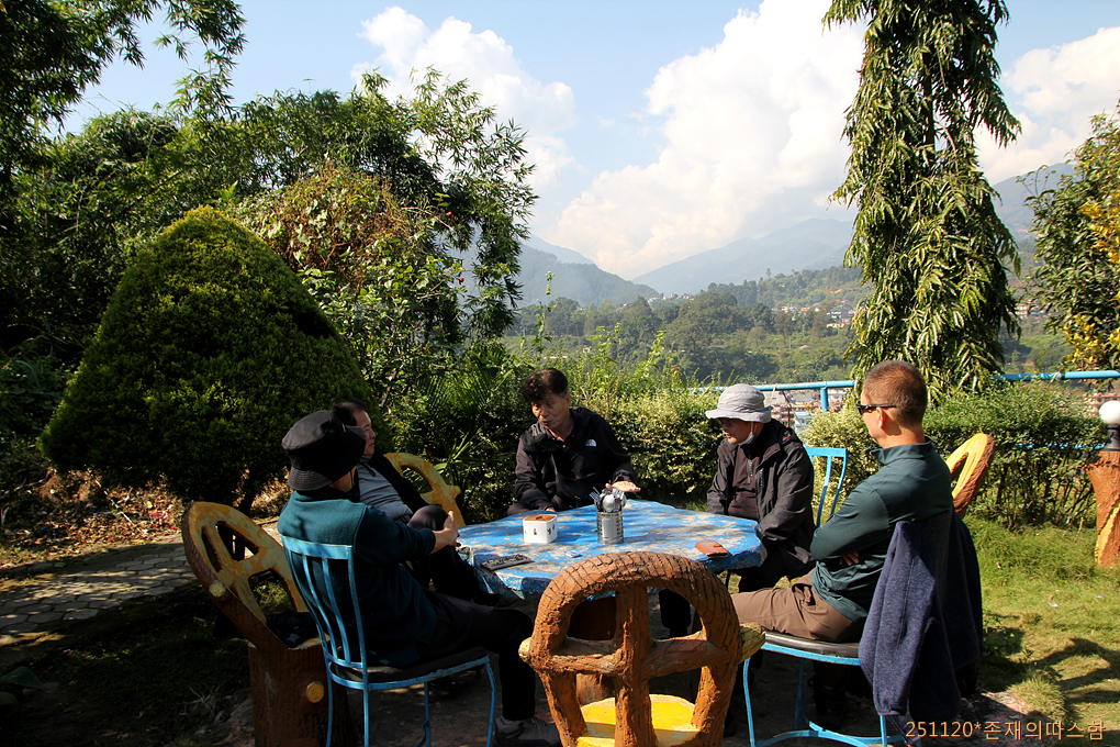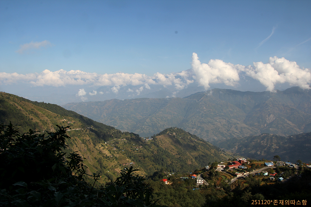 뭉게뭉게 피어오르는 구름을 입고 있는 히말라야 설산 파노라마와 바로 아래 구릉에 자리잡고 있는 마을 풍경이 어울려 멋진 풍경화가 되었다. 왼쪽으로 가네슈히말, 오른쪽으로는 랑탕히말 설산군들이 아닐까 싶다.
