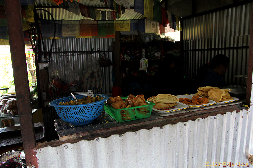 30분쯤 내려선 허릿길, 허름한 구멍가게 휴게소에서 차 한잔의 휴식과 함께 네팔의 튀김 맛을 즐긴다.