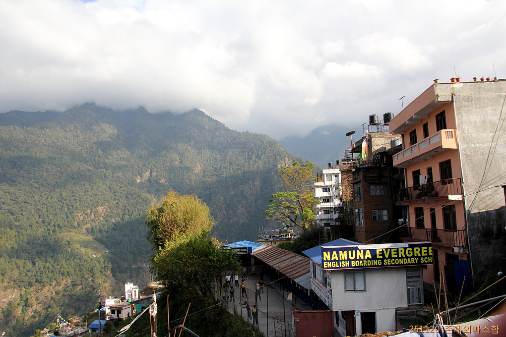 중간에 한번의 검문소를 지나 둔체에서 또 다시 여권을 검사 받는다. 둔체는 카트만두에서 120km 떨어진 제법 큰 마을로 높은 산허리에 자리잡은 랑탕국립공원의 관문이다. 히말라야 설산 조망이 아름다운 곳이라는데 구름 때문에 먼 설산 풍경이 환히 열리지 않아 아쉽다.