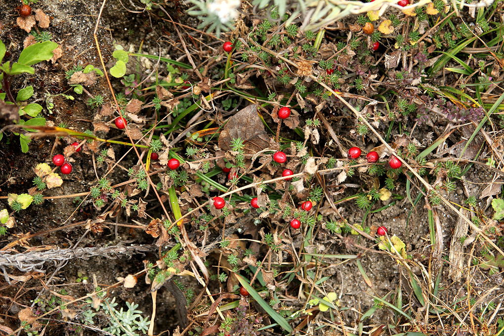 줄기가 땅을 기며 붉은 열매를 달고 있는 히말라야 레드베리 크리퍼(Himalayan Redberry Creeper), Hemiphragma heterophyllum. 현삼과의 풀로, 뛰어난 항산화 성분이 있다고 한다.