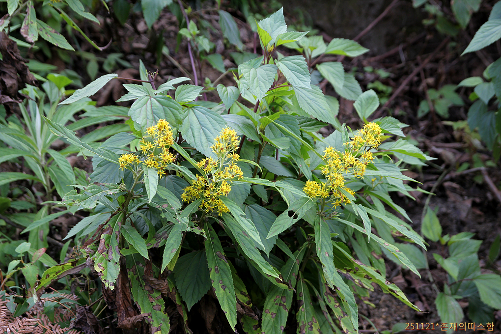 긴 타원형의 커다란 잎에 노란꽃을 피운 이 식물. 트레킹 내내 흔하게 보이는 풀이다. 미역취속(Solidago)이지 싶었는데 Synotis cappa라는 처음 보는 종이다. 중국 이름은 밀화합이국(密花合耳菊).