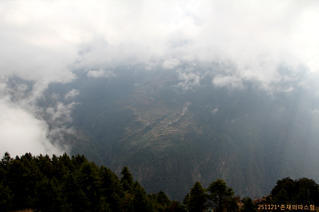 건너편 자욱한 구름속에 모습을 드러내는 툴로샤브루 마을.