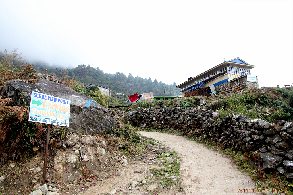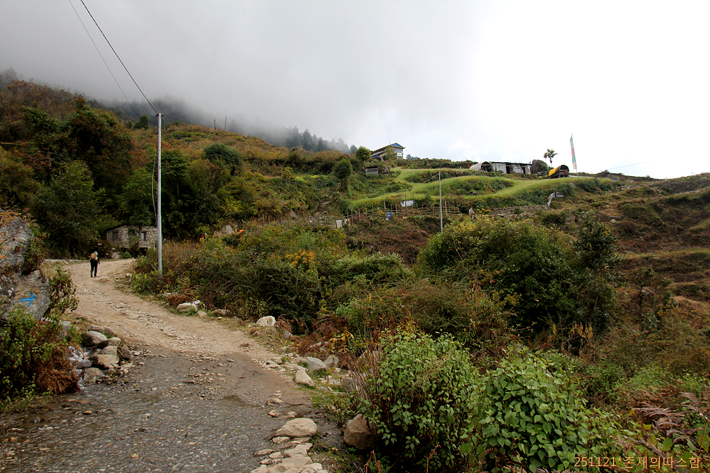 드디어 오늘의 목적지인 '세르파의 고향', 짙은 안개에 잠긴 세르파가온 마을(2510m)에 들어선다. 두 그루 나무 사이로 희미하게 우리 숙소 녹색 건물이 보인다.