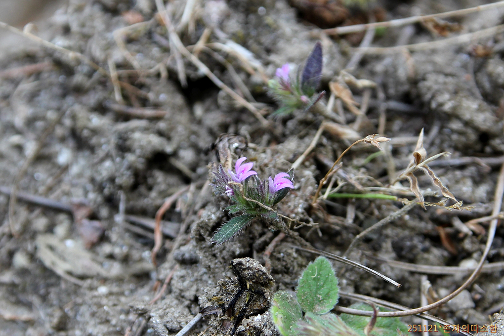쥐꼬리망초속(Justicia)의 아주 작은 풀꽃. 거센털이 나 있는 잎이 인상적이다.