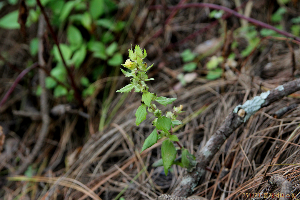 형태만 보면 며느리밥풀을 연상시키는 식물. 노란 꽃이 입을 다물고 있다. 중국에서 흑삭속(黑蒴属)으로 분류하는 Alectra sessiliflora로 보인다. 아프리카에서 동남아-히말라야-중국 남부까지 분포하는 열당과의 기생식물이다.
