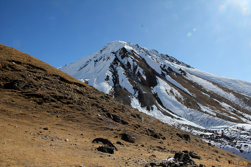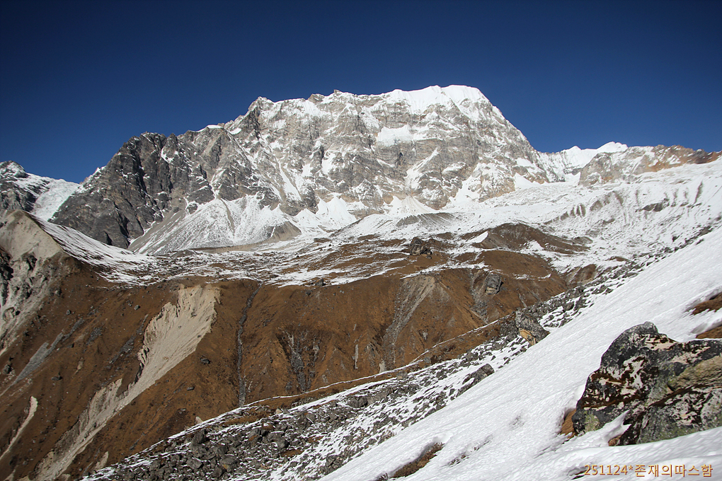 앞쪽 눈이 없는 낮은 산이 강진리(로우 4400m, 어퍼 4604m)j 이다. 지금쯤 대한봉 님과 빈샘 님이 저곳을 향해 오르고 있을 것이다.