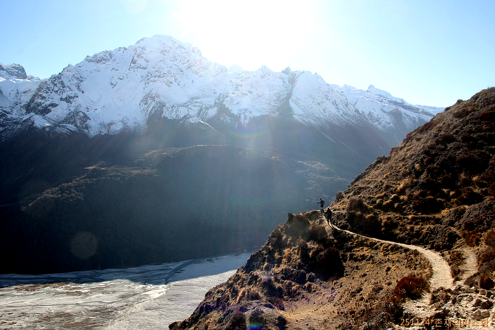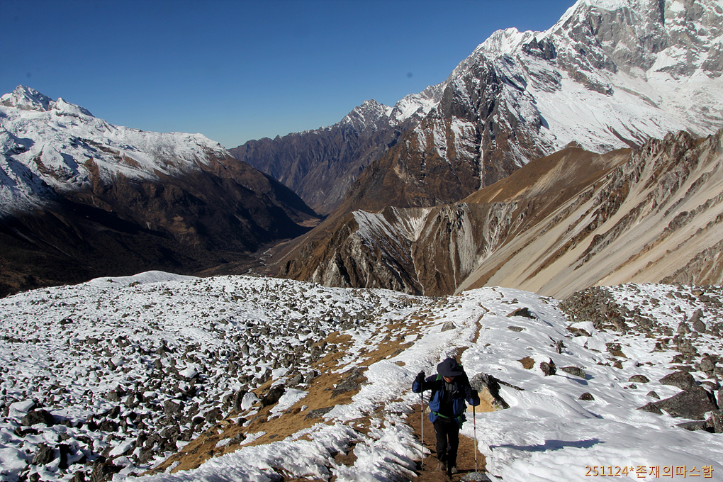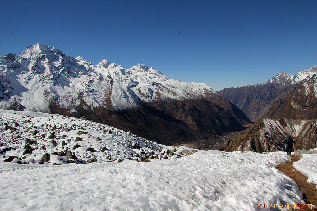 높아만 보이던 건너편 설산들이 이제 편안한 눈높이로 손에 잡힐 듯이 다가선다. 어제 걸었던 랑시사 카르카로 가는 계곡은 꽝꽝 얼어붙은 모습이다.
