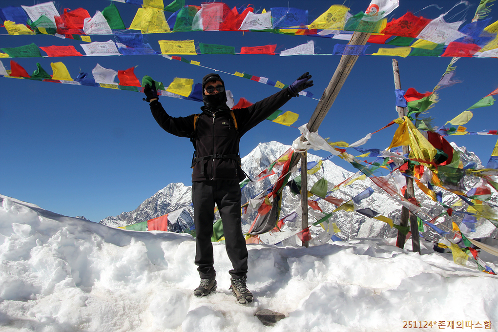 타르초가 펄럭이는 정상, 하늘 위에는 티베트 까마귀, 노랑부리까마귀(Alpine chough)들이 선회비행하며 정상 등반 성공을 축하하는 듯 독특한 울음소리로 인사를 건넨다.