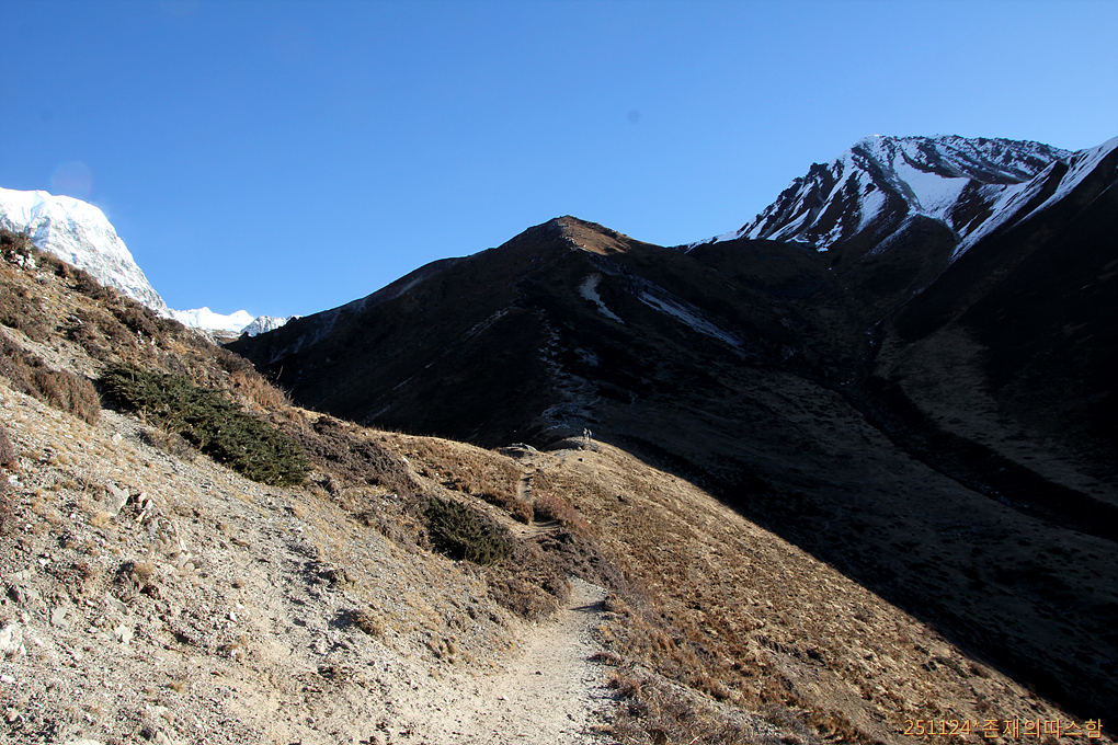마을 뒤를 돌아 랑탕계곡 체르고리봉 발치로 이어지는 길로 접어든다.