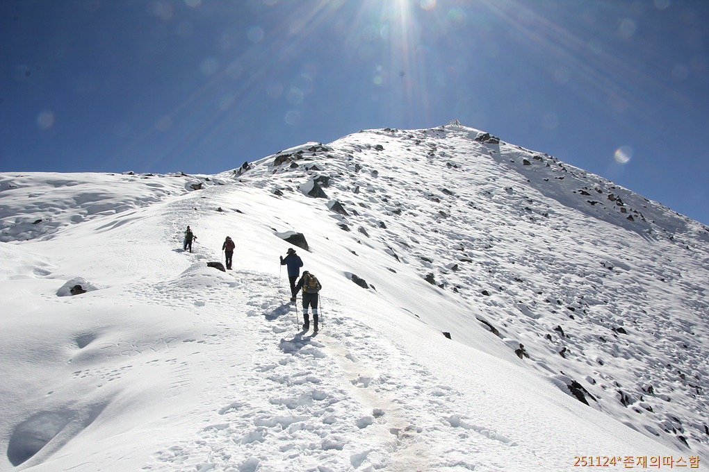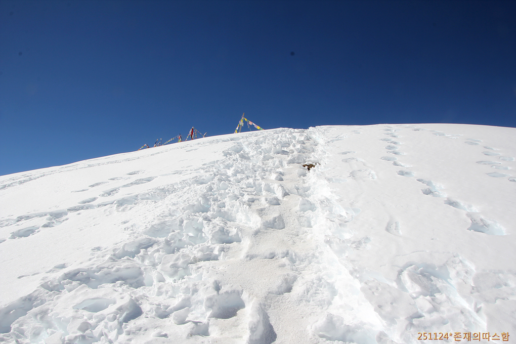 가쁜 숨을 내쉬며 정상으로 향한다. 끝없이 펼쳐지는 고산 설원에다 정면 정상 위에서 빛나는 햇살까지 더해져 고글 착용에도 눈부심이 너무도 강렬하다.