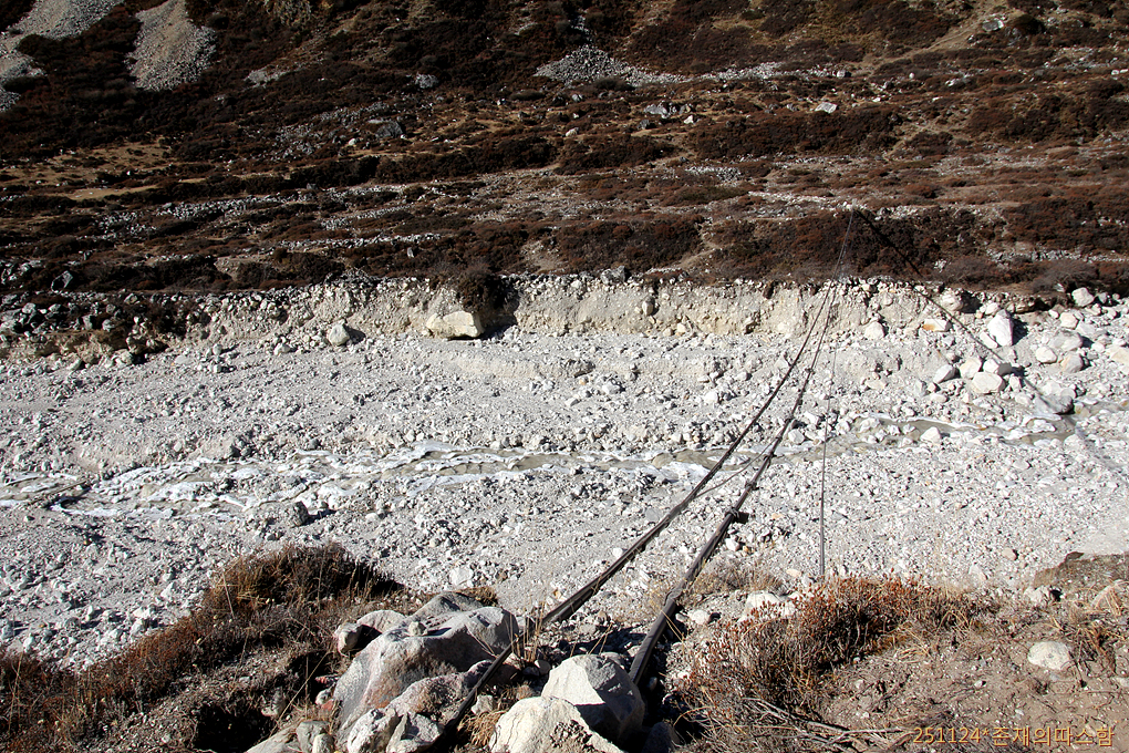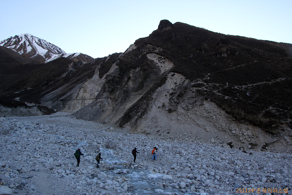건너서 돌아본 풍경. 어두운 계곡 풍경을 살려 찍으니 랑탕리룽이 너무 밝게 표현되었다.