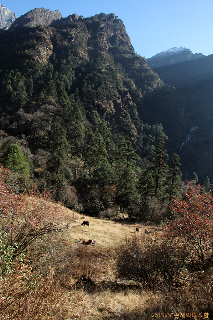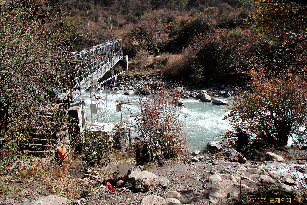 오를 때 점심식사를 했던 고라타베라의 러블리게스트하우스를 지나 오후 1시 50분쯤 랑탕계곡을 건너며 야크와 말 방목지 숲길로 들어선다.