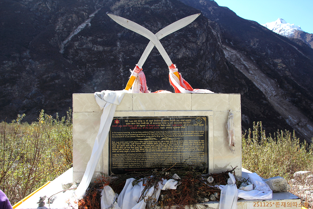 추모비를 지난다. 2015년 4월 25일 랑탕마을 대지진 때 안전 및 수색 작전을 수행하다 사망한 네팔 육군 장병들을 추모하기 위해 세워진 기념비다.