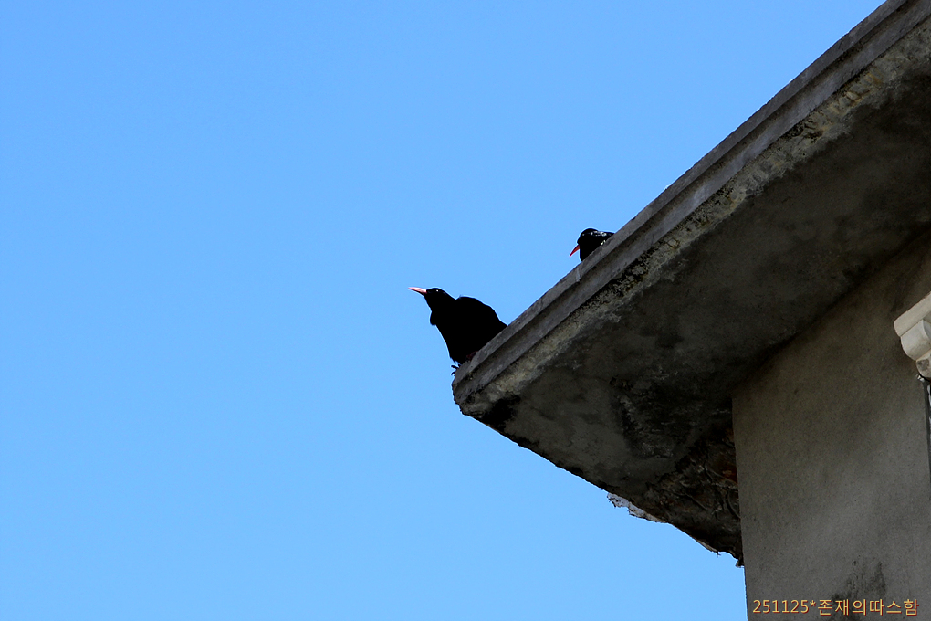 마을 창가에 지저귀고 있는 붉은부리까마귀. 노랑부리가마귀와 같은 붉은부리까마귀속으로 생김새도 울음소리도 매우 비슷해 보이는데 부리가 아래로 살짝 굽었다. 우리나라에서도 관찰된 적이 있는 까마귀과의 새다.